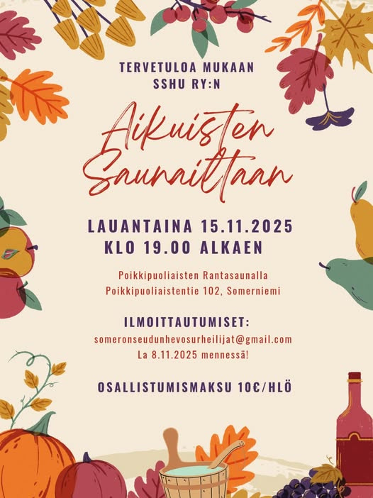 Tervetuloa mukaan SSHU ry:n Aikuisten Saunailtaan lauantaina 15.11.2025 klo 19.00 alkaen Puoliaisten Rantasaunalle (Poikkipuoliaistentie 102, Somerniemi)!