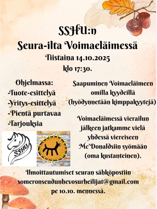 Tervetuloa mukaan SSHU ry:n Seura-iltaan Salon Voimaeläimeen tiistaina 14.10.2025 klo: 17:30!