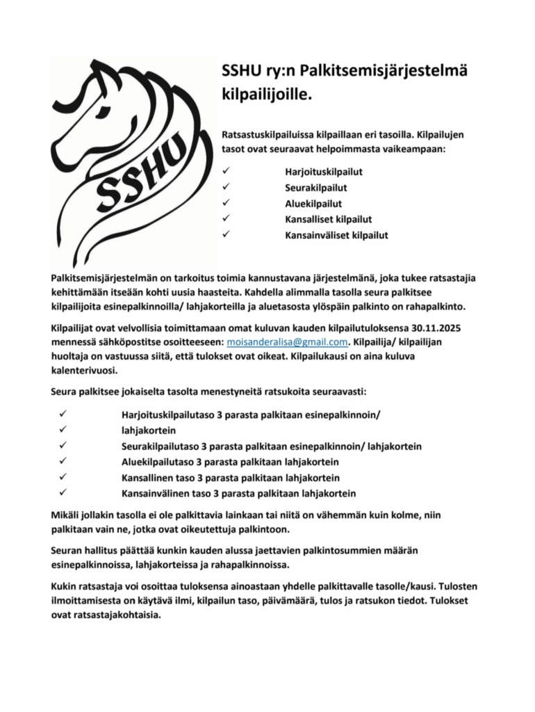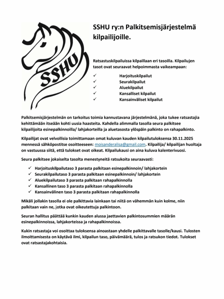 Tulemme palkitsemaan su 7.12.2025 Puurojuhlan yhteydessä kauden 2025 aikana kilpailleita seuralaisiamme SSHU ry:n Palkitsemisjärjestelmän mukaisesti!