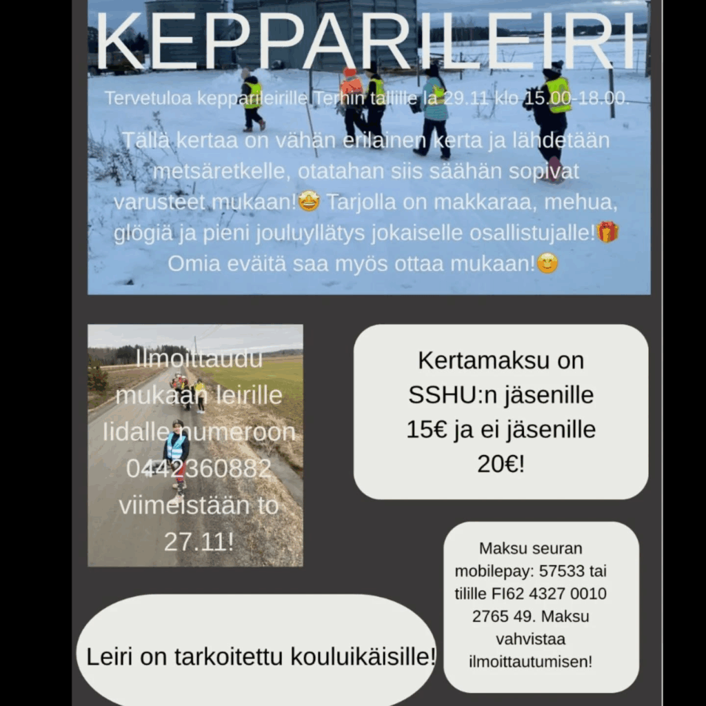Kepparileiri 20.11.2025 | Ei kommentteja Lisätietoa ensi viikon kepparileiristä pikkujoulu teemalla! Muista ilmoittautua mukaan! Avainsanat: @terhintalli, #kepparikerho, #Someronseudunhevosurheilijat, #SSHU, #Yhdessä