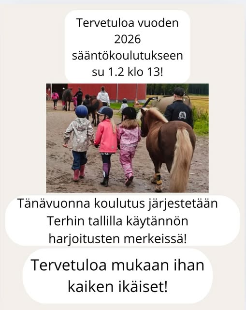 Someron seudun Hevosurheilijat järjestää kaikille avoimen kilpailusääntökoulutuksen Terhin Tallilla sunnuntaina 1.2. Klo 13. Tervetuloa ihan kaiken ikäiset!