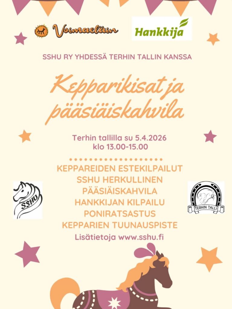 Paikalla SSHU ry:n herkullinen pääsiäiskahvila sekä luvassa paljon muuta ohjelmaa; talutusratsastusta, Hankkijan kilpailu sekä keppareiden tuunauspiste!
