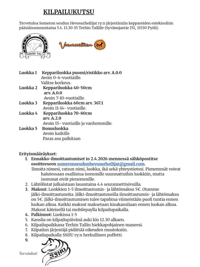 Mukaan kilpailuihin voit ilmoittautua ennakkoon to 2.4.2026 mennessä sähköpostitse osoitteeseen: someronseudunhevosurheilijat@gmail.com!