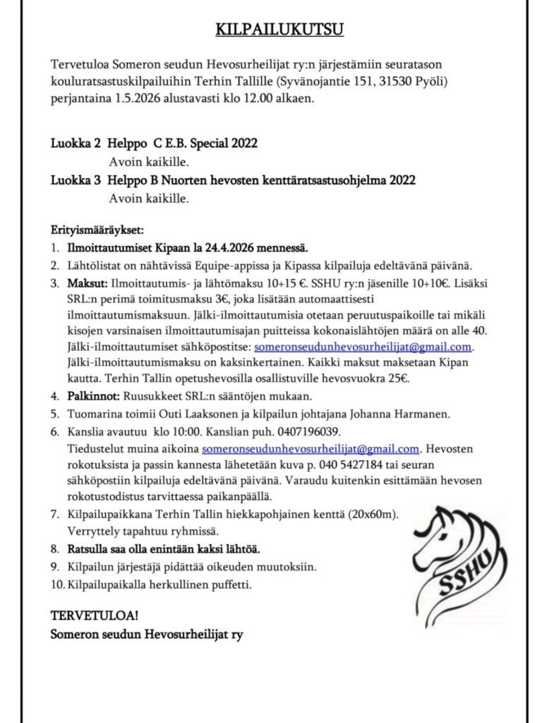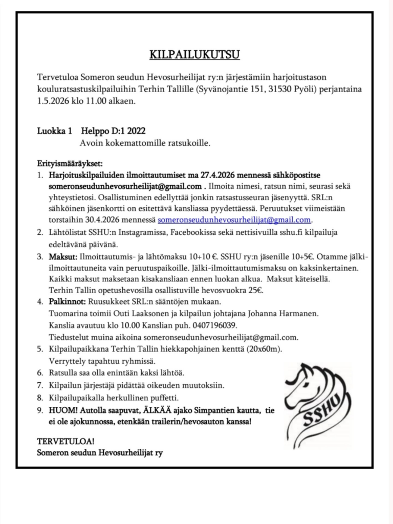 Harjoituskilpailuiden ilmoittautumiset ma 27.4.2026 mennessä sähköpostitse osoitteeseen: someronseudunhevosurheilijat@gmail.com